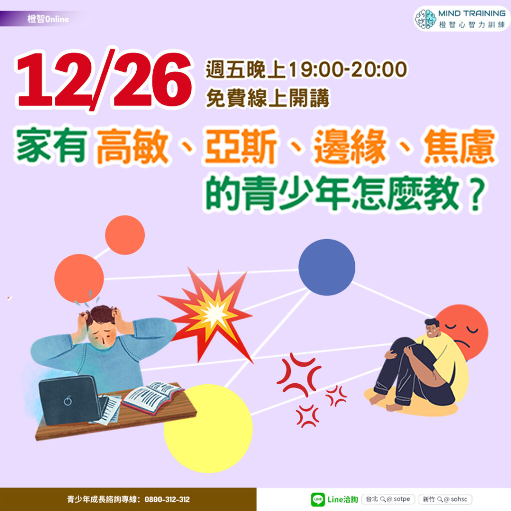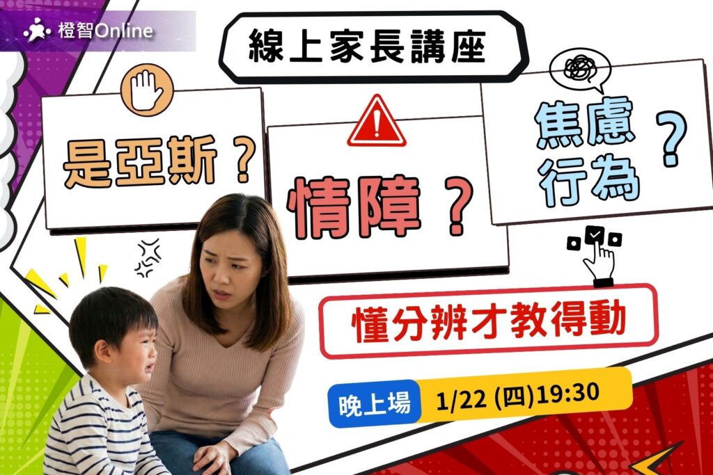 【線上家長教養講座】 兒童情緒管理、注意力學習、中文居家學習、青少年教養學習 Posted on 2021-12-072025-12-26Posted in 兒少教育知識Tagged 中文, 家長教養, 情緒, 社交, 線上, 表達, 邊緣型兒童, 閱讀困難, 青少年 專注力、情緒管理、人際社交、自信心等已經成為許多家長關心的議題,希望可以有更多方法幫助孩子更快速融入這個大環境。教養是一條漫長的路,從孩子出生到進入幼兒園,到小學、國高中,一路上爸爸媽媽跌跌撞撞,從不熟悉到熟悉,從緊張焦慮到從容面對,孩子在每一個時期都會遇到不同的教養困擾。橙智經營家庭學習中心逾20年時間,從家長學習到教師研習到兒童訓練,我們將累積多年的教學經驗透過各式線上講座分享給所有爸爸媽媽們,在孩子成長的路上,您並不孤單,橙智這一系列的家長教養講座,將提供全國的爸爸媽媽們,不論您在哪裡,都可以接受到最新的教養訊息喔!立即加入Line好友,有客服人員為您服務台北中心:@sotpe 新竹中心:@sohsc洽詢電話:0800-312312台北轉1新竹轉2 【家長線上講座】線上聽講,全程免費,學習教養有方法 ★ 適合對象 :家長、教師、對此內容有興趣者。★ 是亞斯?情障?還是焦慮行為?懂分辨才教得動 1/22(四)1930-2030 孩子讀中文老是有看沒有懂?三招打造閱讀腦 1/21(三)1930-2030 養出韌性,拒絕任性!從生活小事養出抗壓力 1/15(四)1930-2030 兒童情緒管理1/20(二)1930-20301/23(五)1200-1300 青少年家長線上講座 場次資訊 12/19(五) 19:00 線上場 1. 學會安定情緒,降低衝動爆發 2. 分解任務步驟,養成行動習慣3. 建立3C界線,學會自我節制4. 跨域體驗訓練,提升專注紀律 場次資訊 12/26(五) 19:00 線上場 1. 引導敏感特質,轉化觀察優勢2. 人際情境練習,掌握互動節奏3. 情緒配速練習,降低緊繃焦慮4. 團隊合作訓練,累積自信能量 立即報名 【中文線上課程】 客製化中文教學1對1指導,低年級打基礎,中年級提升理解,高年級輕鬆解題!每週一小時,讓孩子的學習持續加分>>了解更多 歡迎加入橙智Line@洽詢 電話洽詢