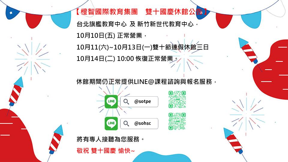 橙智國際教育集團 雙十國慶休館公告 Posted on 2025-10-092025-10-09Posted in 新聞公告 【橙智國際教育集團 雙十國慶休館公告】 台北旗艦教育中心 及 新竹新世代教育中心,10月10日(五) 正常營業,10月11(六)~10月13日(一)雙十節連假休館三日10月14日(二) 10:00 恢復正常營業。 休館期間仍正常提供LINE@課程諮詢與報名服務,台北教育中心LINE@【@sotpe】新竹教育中心LINE@【@sohsc】將有專人接聽為您服務。 敬祝 雙十國慶 愉快~ 更多課程活動資訊,歡迎洽詢: 免費體驗會、公開活動 免費線上講座