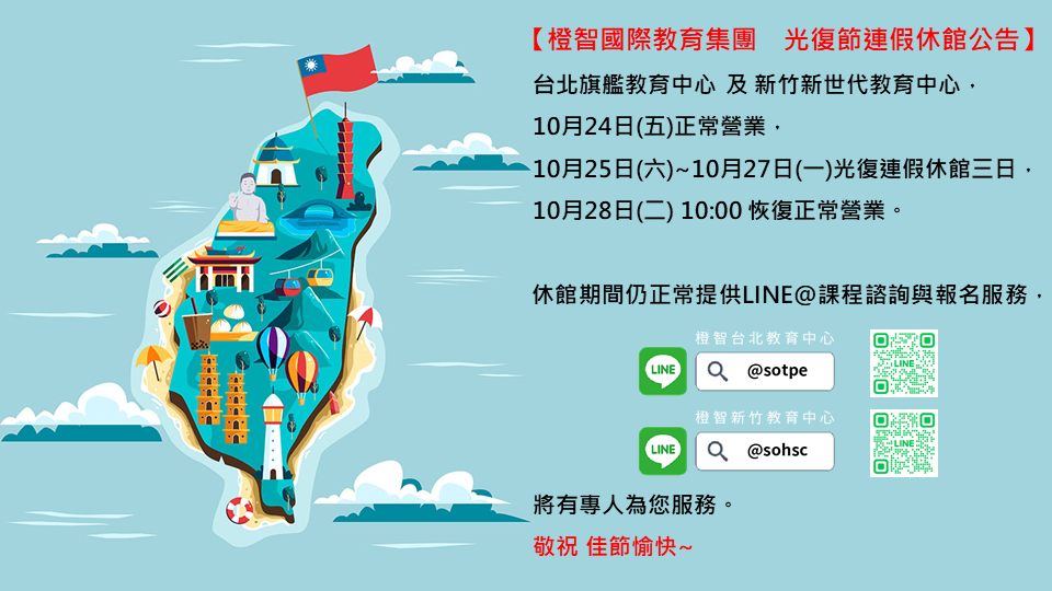 橙智國際教育集團 光復節連假休館公告 Posted on 2025-10-232025-10-23Posted in 新聞公告 【橙智國際教育集團 光復節連假休館公告】 台北旗艦教育中心 及 新竹新世代教育中心,10月24日(五)正常營業,10月25日(六)~10月27日(一)光復連假休館三日,10月28日(二) 10:00 恢復正常營業。 休館期間仍正常提供LINE@課程諮詢與報名服務,台北教育中心LINE@【@sotpe】新竹教育中心LINE@【@sohsc】將有專人為您服務。 敬祝 佳節愉快~ 更多課程活動資訊,歡迎洽詢: 2026冬令營早鳥優惠報名中 免費體驗會、公開活動 免費線上講座