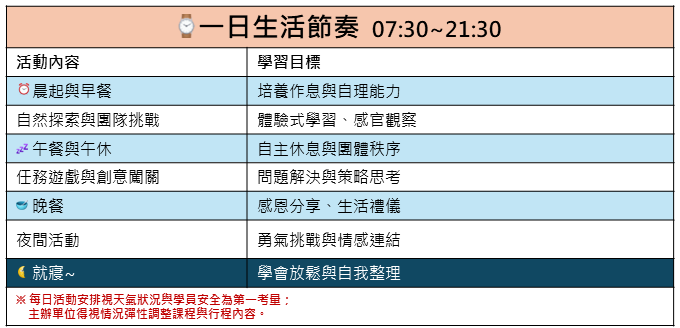 四夜住宿訓練孩子的自理能力與紀律,從整理環境到照顧夥伴,建立生活責任感。