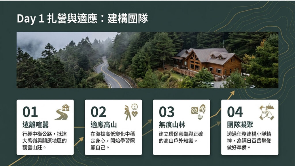 從都市平原至高山百岳,行經中橫公路,抵達觀雲山莊,路途中經歷海拔高低變化,孩子開始學習照顧自己,穩定身心,並與身邊夥伴互相扶持,將透過各項團隊任務,建構小隊精神,開始學習高山無痕山林知識,為隔日登山做準備。