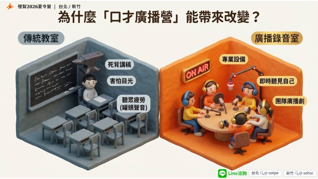 橙智口碑馳名「錄音室課程」,企業規格的專業師資在口才廣播營中為孩子錄製專屬內容,個人自我介紹、新聞讀稿,以及和夥伴共同演繹趣味的廣播劇,透過聲音表情讓劇中角色活靈活現,每一段錄製成果也會讓孩子們帶回家,留存口才廣播營的珍貴紀錄,與家人共享學習的樂趣與成果!
