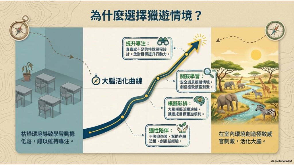 獵遊專注力營深耕兒童黃金發展時期,提供完整學習支持系統強化經驗,供應兒童發展中任務的適性需求,從歡樂學習中,培養正向思維及優良品格,達到能力躍進及專注管理。