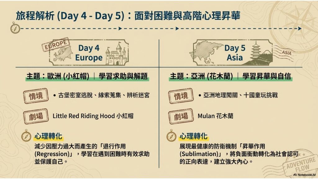 PSafari成長學習:透過【Little Red RidingHood 花木蘭】,學習如何在遇到困難、負面事件的的過程中不直接表達。而是將心中糟糕的衝動或慾望,以社會可以接受的方式表達出來。也就是昇華(Sublimation)作用,是最健康的防衛機制。