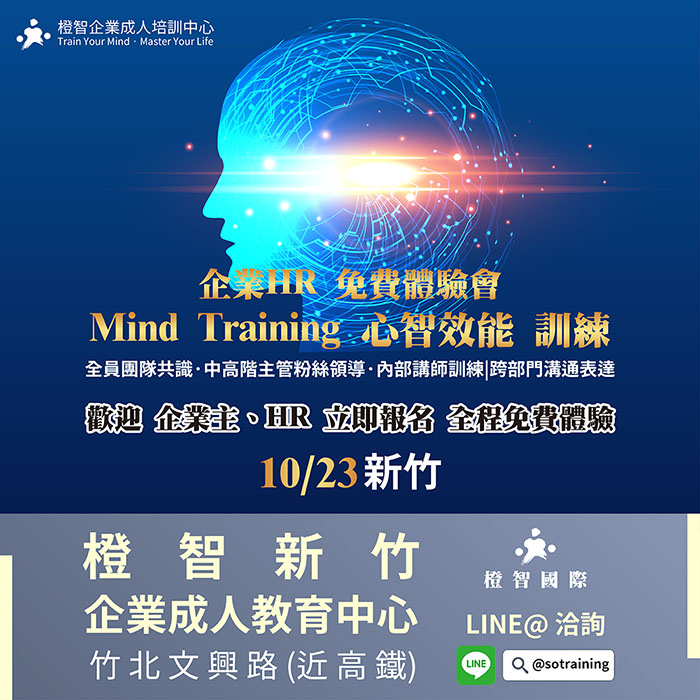 企業HR 免費體驗會 Mind Training 心智效能訓練時間:10/23(四)新竹專屬企業HR人才發展學習的交流體驗會;橙智20多年來為企業教育訓練合作夥伴,從高階領導人到一線基層員工各世代、各階層的訓練成長,為企業永續發展提供一站式全方位的學習服務>> 了解更多