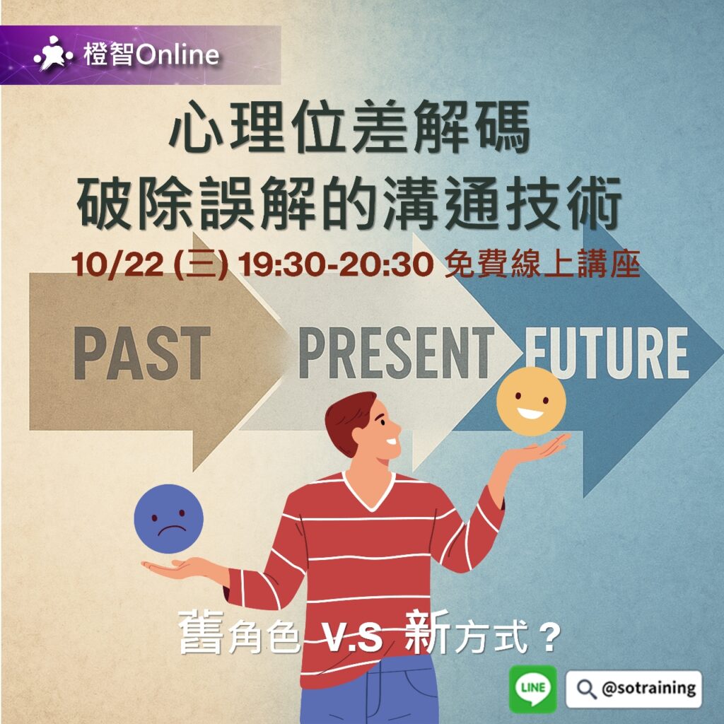 免費【線上】職場講座 – 心理位差解碼:破除誤解的溝通技術 時間:10/8、22(三)1930-2030 這場講座,你將學到:■ 如何縮小心理位差:自我定位 → 對象確認 → 表達調整a.如何將角色清楚化,避免內外期待錯位。b.如何讀懂對方的期待,避免雞同鴨講。c.在主管、同事、客戶、團隊之間,精準表達並建立信任。d.在工作、家庭、親密關係中,說話更準確、更有力量。