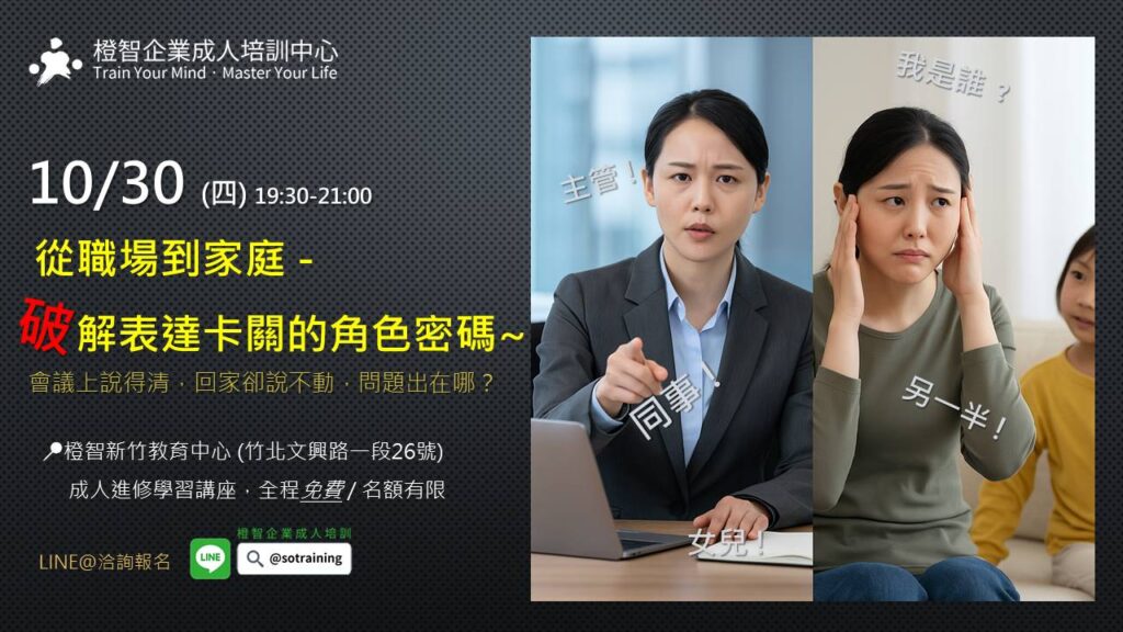 《從職場到家庭,破解表達卡關的角色密碼》實體講座|免費開講|10/30 (五) 19:30 橙智竹北見 Posted on 2025-10-032025-10-03Posted in 公開活動, 成人課程, 未分類 講座大綱 您是不是也會遇到這些情況:⁉️職場會議講了半天,卻沒有人跟進行動…⁉️跟同事溝通進度,得到的回應總是「我不知道耶」…⁉️和另一半討論事情,最後演變成冷戰…⁉️孩子對你說「知道啦」,卻一點改變都沒有…這些狀況不是你不會說話,而是〝角色〞與〝供需關係〞沒對上;當我們沒有看清「我現在是誰? 對方現在需要什麼」,溝通就容易卡關。 🎯 講座內容 👉In Role角色定位:主管、同事、父母、伴侶,不同角色該怎麼說話。👉供需關係:誰需要誰比較多?對話的主導權從這裡開始。👉怎麼說,自己也舒服:讓話不只被聽見,還能被聽進去,創造雙贏。👉實際練習:現場情境演練+講師回饋。 🏆 這堂講座能帶給你 ✅ 懂得用更接近適合自己的方式,來面對不同環境的表達。✅ 拿掉輸贏,溝通表達的目的是為了工作生活更順暢。✅ 關於表達不同角度的參考;你只是沒想過-自己也可以有這樣的面向。 👥 適合對象 ✅ 不想再因為表達而懊惱的夥伴。✅ 也希望別人可以多了解你的夥伴。✅ 對增進表達有興趣的夥伴。 報名資訊 ■ 報名講座場次|從職場到家庭,破解表達卡關的角色密碼 實體講座 新竹10/30(五)1930-2030 ■ 姓名 ■ 年齡 ■ 性別 男 女 ■ 工作單位 ■ 連絡電話 ■ 電子郵件 ■ 居住地區 北北基 桃竹苗 中彰投 雲嘉南 高高屏 宜花東 ■ 如何得知講座資訊 收到橙智電子報 橙智官方Line@通知 橙智同仁Email分享 追蹤橙智FB粉絲專頁 橙智企業成人FB廣告 加入FB社團分享 網路關鍵字搜尋 福委會公告訊息 朋友/同事分享 ■ 報名講座期待 確認報名 🤝企業內部教育訓練合作 🤝個人成長進修需求歡迎加入LINE@sotraining,留言洽詢或電📲0800-312312 轉1