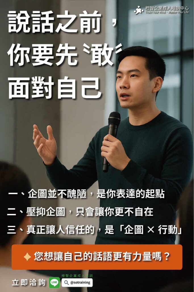 說話之前,你要先〝敢〞面對自己|企業教育訓練專刊 Posted on 2025-11-262025-11-27Posted in 專欄【企業教育訓練專刊】, 未分類 大部分的人以為自己不會說話,是因為邏輯不好、反應不夠快、記性差…所以開始拼命練技巧=背稿、模仿語氣、調整姿勢…有沒有想過,真正的難題從來不是技巧=而是⚠️你不敢誠實面對自己「到底想說什麼」。你害怕承認 : 想被理解、想被看見、想被認可;於是你選擇說一些安全、中性、得體的話。結果不會錯,但也💔沒有力量、沒有溫度、沒人記得。🫵練習面對你自己~ 一、企圖並不醜陋,是你表達的起點 我們從小被教導「不要太有野心」,所以一開口就想顯得中規中矩。回想看看,真正動人的表達,都是有企圖的——「我希望你理解我。」「我希望你支持我。」「我希望你知道這件事很重要。」當你敢說出〝為什麼〞而說,你的語氣就會👍自然穩定、真實、有力量。 二、壓抑企圖,只會讓你更不自在 你越壓抑自己的想要,話就會越不自然、越空洞。你以為你在保護自己,觀眾卻只感覺到➡️距離。反過來~當你敢承認心裡那句「我想要」,你的眼神、節奏、語氣會突然對上焦,甚至講得更簡單、卻更能打動人。 三、真正讓人信任的,是「企圖 × 行動」 誠實說出自己的企圖,是第一步。但真正讓人相信你的是🔐「你接下來準備怎麼做。」你的語言,一旦和行動連在一起,信任感就會被建立,你的表達也會變得更穩、更勇敢 想變成會說話的人,不是先練技巧,而是先練 🫂誠實的面對自己。🏆因為只有你敢承認自己的想要,別人才會真正願意聽你說。 🔶 您想讓自己的話語更有力量嗎?如果您正在:■ 突破自己,卻不知道從哪開始■ 明明有想法,卻常常講不清楚■ 心裡很努力,但表達總是被誤解■ 上台、開會、面對主管就會緊張■ 想讓自己的語氣更穩、邏輯更清晰、 表達更有影響力歡迎您可以加入 一對一表達與自信教練 在橙智的一對一課程裡,我們會帶領您:✨ 找到您真正「想說的那一句」✨ 整理您的企圖,讓語氣自然變得有力量✨ 設計屬於您的表達方式,而不是套招✨ 訓練您在不同情境都能穩住自己的能量✨ 幫您建立「能被看見」的自信當您敢誠實面對自己,表達不再是壓力,而是一種真正的魅力。如果您也準備好讓自己被聽見,歡迎來到橙智,我們成為您最安全的秘密基地,親自教練帶您走上這一步。 ✅更多訓練資訊📌訓練型式 : 一對一教練(實體/線上)、小班制工作坊📌訓練地點 :■台北=橙智台北企業成人培訓中心(信義區基隆路二段51號14樓)■竹北=橙智新竹教育中心(竹北文興路一段26號;近新竹高鐵)■線上視訊洽詢電話:0800-312312 轉1 MeiLine@洽詢:搜尋或點選@sotraining 公 眾 演 說 一 對 一 教 練 諮 詢 姓名 性別 年紀 工作單位/職稱 聯絡電話 電子郵件 來自縣市 大台北 基隆 桃園 新竹 苗栗 台中 彰化 南投 雲林 嘉義 台南 高雄 屏東 宜蘭 花蓮 台東 澎湖 金門 連江 如何得知此課程 收到橙智電子報 追蹤橙智企業培訓Facebook 看到橙智企業培訓FB廣告 收到橙智同仁Email分享 HR夥伴分享 網路關鍵字搜尋 洽詢課程需求 確認送出,並加入Line@與專人聯繫 更多企業內訓 溝通表達系列課程:📌 跨世代溝通📌 內部講師訓練📌 主管公眾演說訓練📌 跨部門溝通表達訓練📌 新世代員工對上溝通表達技巧免費 線上學習資源:📌 心理位差解碼:破除誤解的溝通技術 聯 絡 我 們